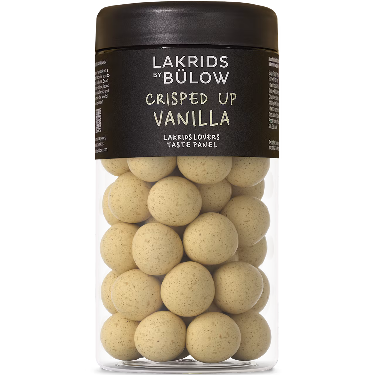 CRISPED UP VANILLA innehåller vår signaturlakrits överdragen med krämig vit choklad, berikad med den aromatiska essensen av Madagascar Bourbon Vanilla. Tillsatsen av puffat ris ger ett härligt krisp som kompletterar chokladens lena konsistens. Resultatet är en ljuvlig kombination av krämigt och krispigt, med en balanserad smakprofil av sött och lakritsens distinkta intensitet – en riktigt njutbar godbit för både lakritsentusiaster och nyfikna nybörjare.