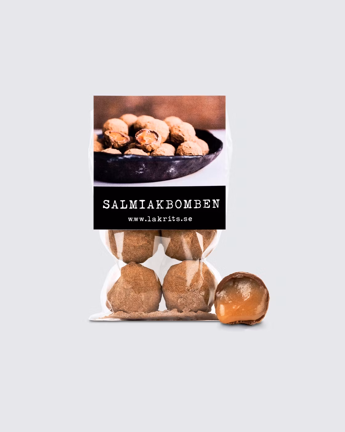 Chokladpralin fylld med kolakräm och rullad i saltlakritspulver. En himmelsk blandning av lakrits, salmiak och mjuk kola – en delikat explosion av sött och salt.