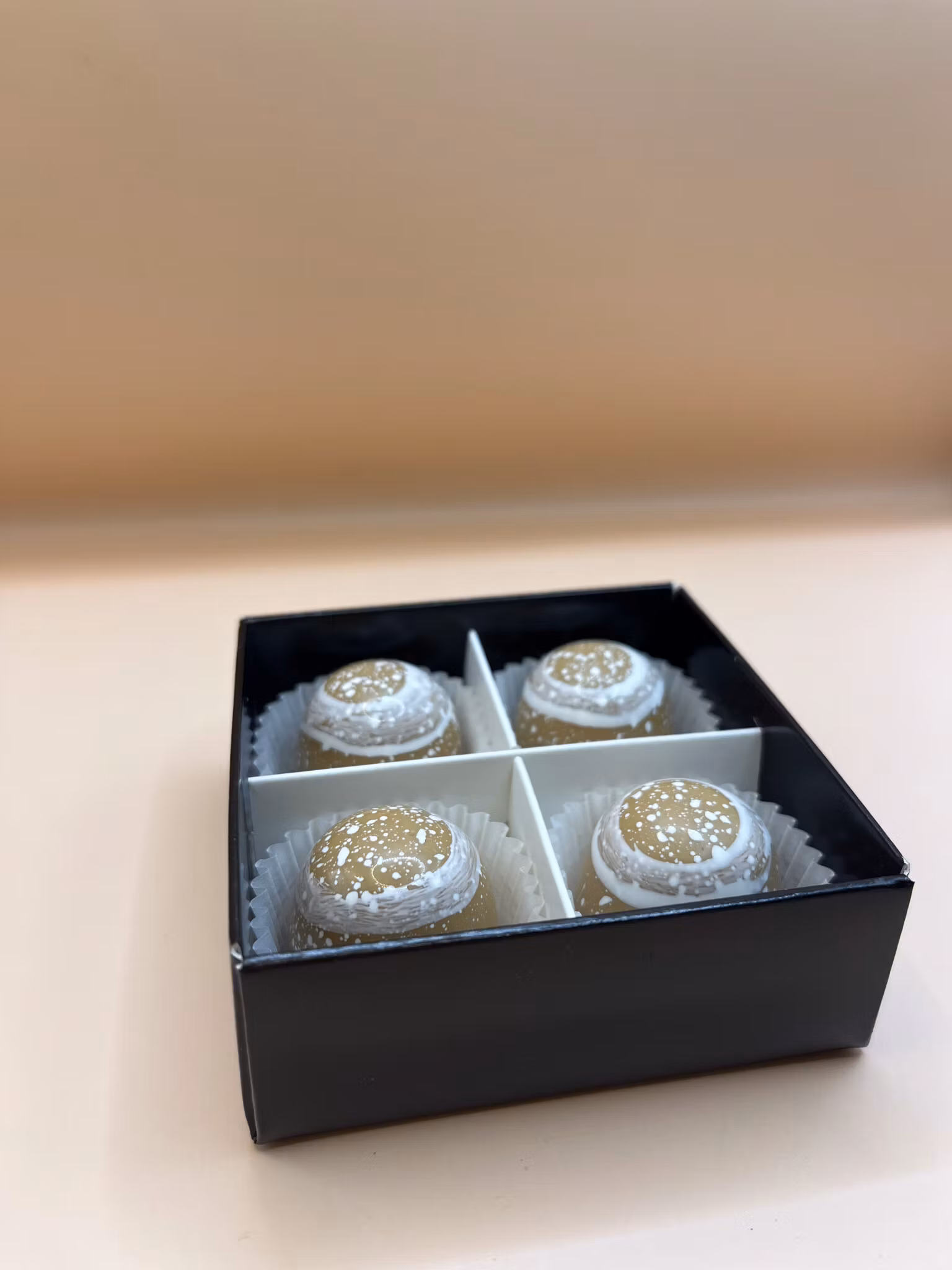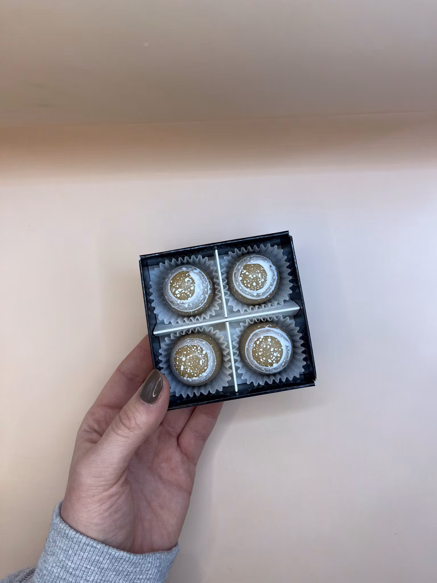 Varje pralin är putsad, gjuten och fylld förhand. Detta gör att alla blir unika och omsorgsfullt gjorda.